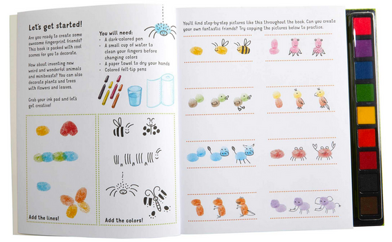 Fingerprint Friends comes with plenty of ideas for how to turn a colorful fingerprint into a menagerie of animals and creatures, offering something for every interest!